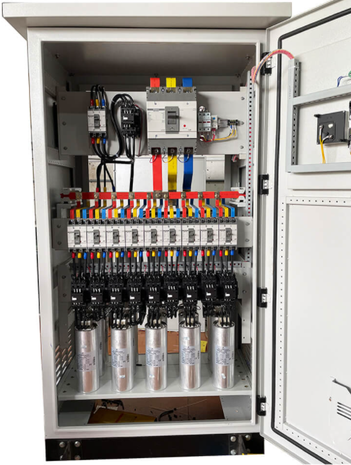 The capacitor bank has the function of improving the Cosφ coefficient for the power system, reducing the loss on the transmission line, increasing the power transmission capacity of the line and transformer. The typical reactive power compensating capacitor cabinet consists of Capacitors connected in parallel with the load, controlled by an automatic compensating capacitor controller through a contactor switch device.