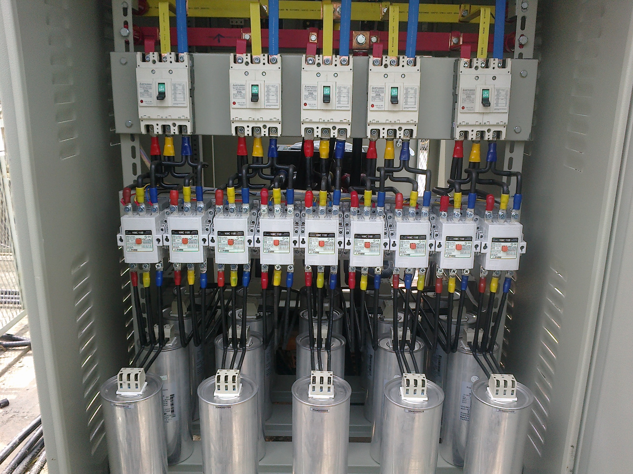 The capacitor bank has the function of improving the Cosφ coefficient for the power system, reducing the loss on the transmission line, increasing the power transmission capacity of the line and transformer. The typical reactive power compensating capacitor cabinet consists of Capacitors connected in parallel with the load, controlled by an automatic compensating capacitor controller through a contactor switch device.